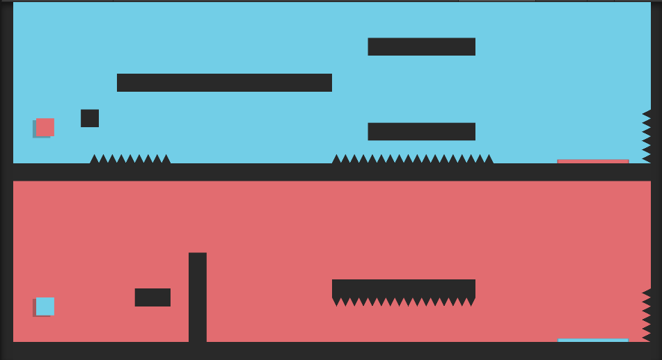 You controll two different blocks on different screens. The Goal: both blocks need to make it to the coloured platforms. Right now there are only 5 Levels available.